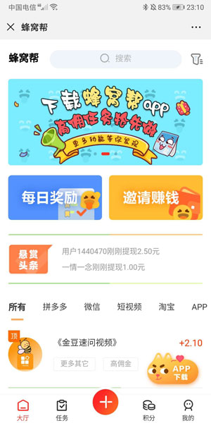 安卓版下载 大小:5.07 MB 下载:3256次 蜂窝帮 支 持:安卓苹果 分 类:手机软件 大 小:5.07 MB 版 本:1.0.12 评 分: 开发者:重庆夭夭网络科技有限公司 下载量:3256次 发 布:2020-03-14 10:01 手机扫码免费下载 #蜂窝帮截图 #蜂窝帮简介 蜂窝帮,让您的闲暇时间变得更有价值。蜂窝帮APP是一款手机悬赏任务平台,悬赏、互助,帮人忙就能赚钱!用户在这里,不仅可以通过完成悬赏任务来赚佣金,还可以发布任务供其他用户完成。海量悬赏任务,让你的业余时间变得更有价值! 【平台特点】 上一个 上一篇:牛帮 下一个 下一篇:钱帮 猜你喜欢 玩赚星球3256次下载 下载 大六顺3256次下载 下载 西柚资讯3256次下载 下载 快音3256次下载 下载 金刚涨3256次下载 下载 抢先收3256次下载 下载 趣看天下3256次下载 下载 中青看点3256次下载 下载